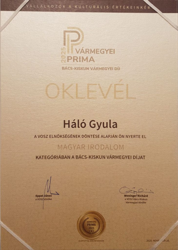 Szívből gratulálunk Háló Gyulának a Bács-Kiskun Vármegyei Prima Díjhoz magyar irodalom kategóriában!